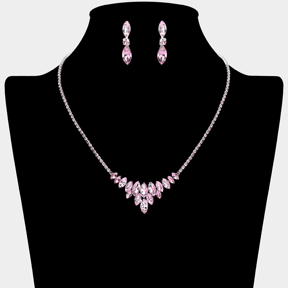 • Elegant marquise cut rhinestone statement set featuring a dramatic V-shaped drop necklace constructed from cascading stones and a delicate line chain. The sophisticated necklace pairs perfectly with the included dangle earrings. Ideal accessories for brides, proms, galas, and formal events. This stunning set makes a bold and dazzling style statement.