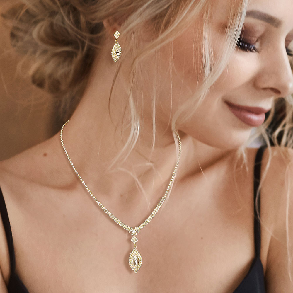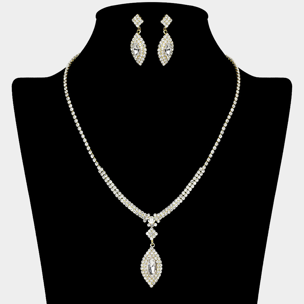 • Elegant marquise pendant rhinestone necklace and earring set featuring a refined crystal drop design with dazzling brilliance. Perfect for weddings, proms, and special occasions, this jewelry set enhances your look with timeless sophistication and radiant sparkle.