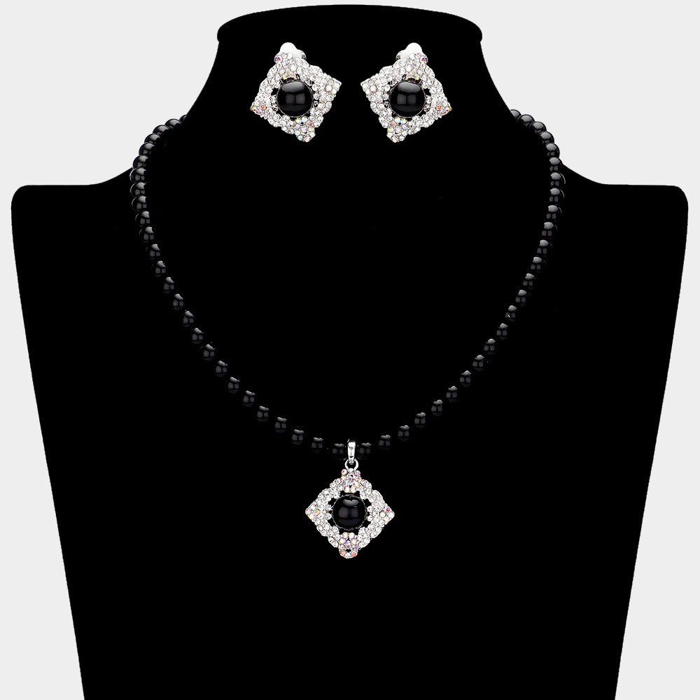 Pearl Centered Stone Paved Pendant Pointed Necklace