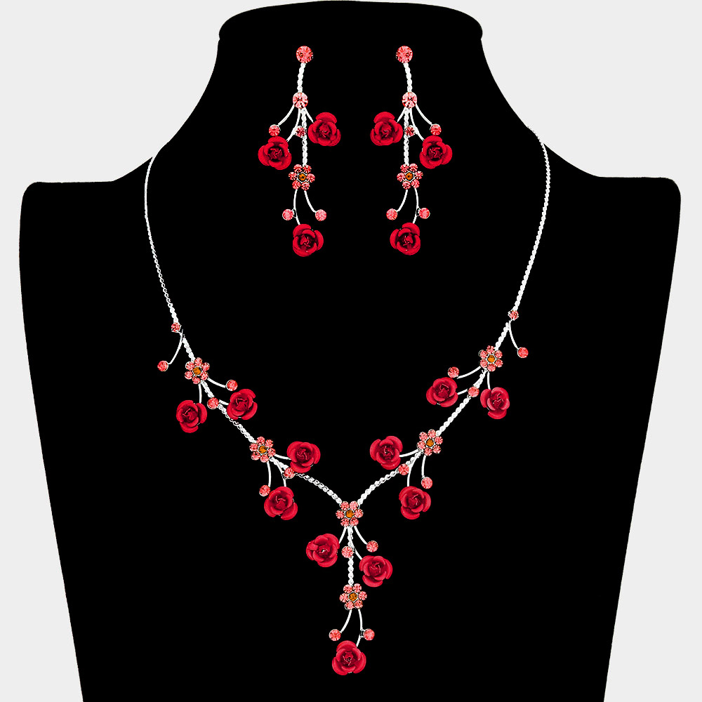 Rhinestone Embellished Rose Flower Cluster Vine Necklace