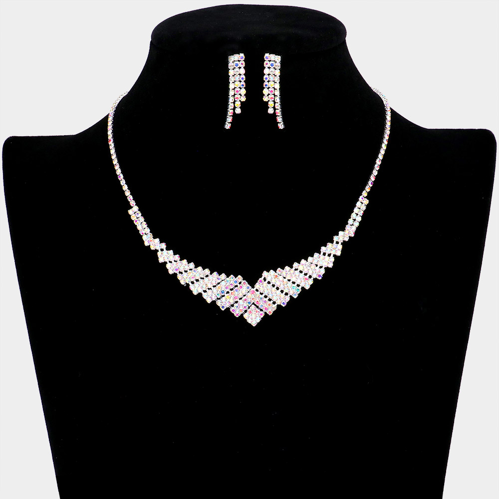 Details • Necklace Size : 13" + 4" L • Decor Size : 0.5" L • Earrings Size : 1.1" L • Dazzle at weddings, parties, or proms with this rhinestone chevron necklace and matching earrings set. The layered geometric design brings brilliance and refinement, making it the perfect accessory for formal events, evening looks, and any celebration that calls for timeless sparkle.