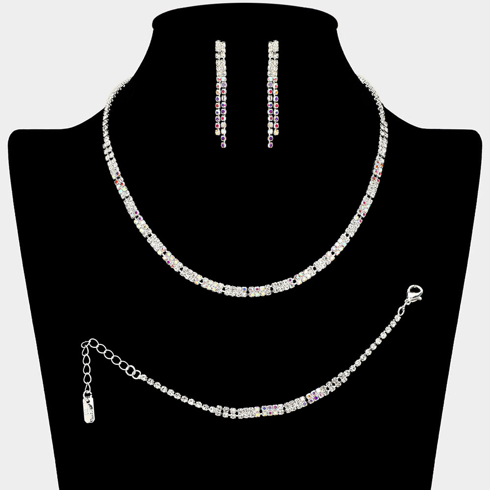 • This radiant jewelry set features a shimmering rhinestone design with a matching necklace, bracelet, and long drop earrings. Its brilliant sparkle and refined elegance make it ideal for weddings, formal events, and evening occasions, adding a luxurious touch to any outfit.