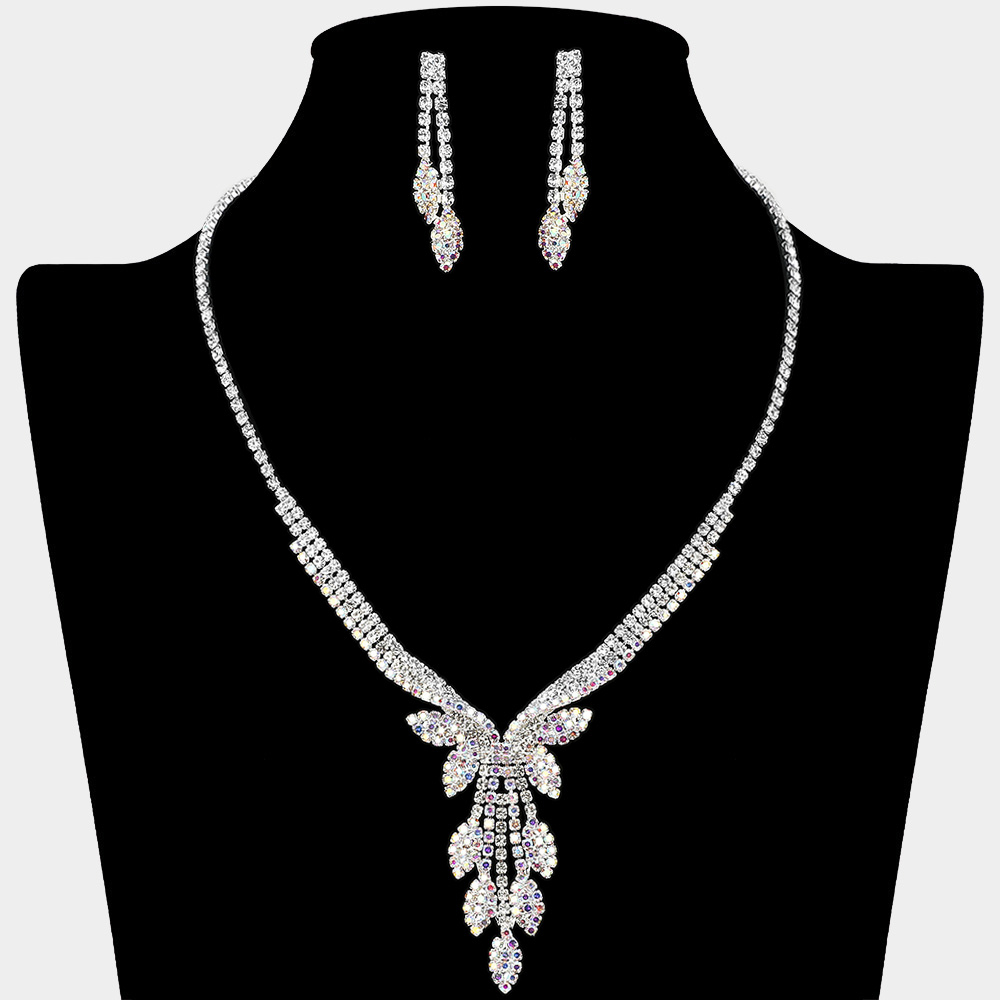 • This elegant rhinestone necklace and earring set showcases a dazzling leaf drop design with iridescent shimmer that catches every light. Perfect for formal events, weddings, or evening wear, it adds radiant sophistication and a graceful sparkle to elevate any special occasion look.