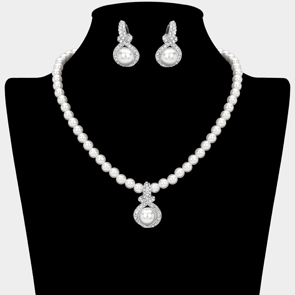 Details • Necklace Size : 15.5" + 3" L • Decor Size : 1.25" L • Earrings Size : 1.25" L • Grace your neckline with this stunning single strand pearl necklace and matching earrings, featuring dazzling crystal accents that add timeless elegance. Ideal for weddings, parties, or evening wear, this classic jewelry set captures refined sophistication with a radiant touch.