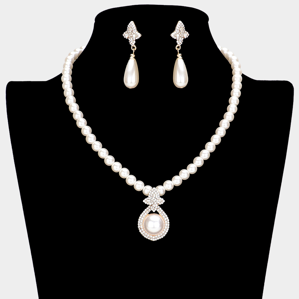 Details • Necklace Size : 14.5" + 3.5" L • Pendant Size : 0.8" X 1.5" • Earring Size : 1.75" L • Elevate your elegance with this stunning teardrop pearl necklace and earring set, featuring a refined crystal-accented design. Perfect for weddings, formal occasions, or special celebrations, this timeless jewelry set brings sophistication and radiant charm to every outfit.