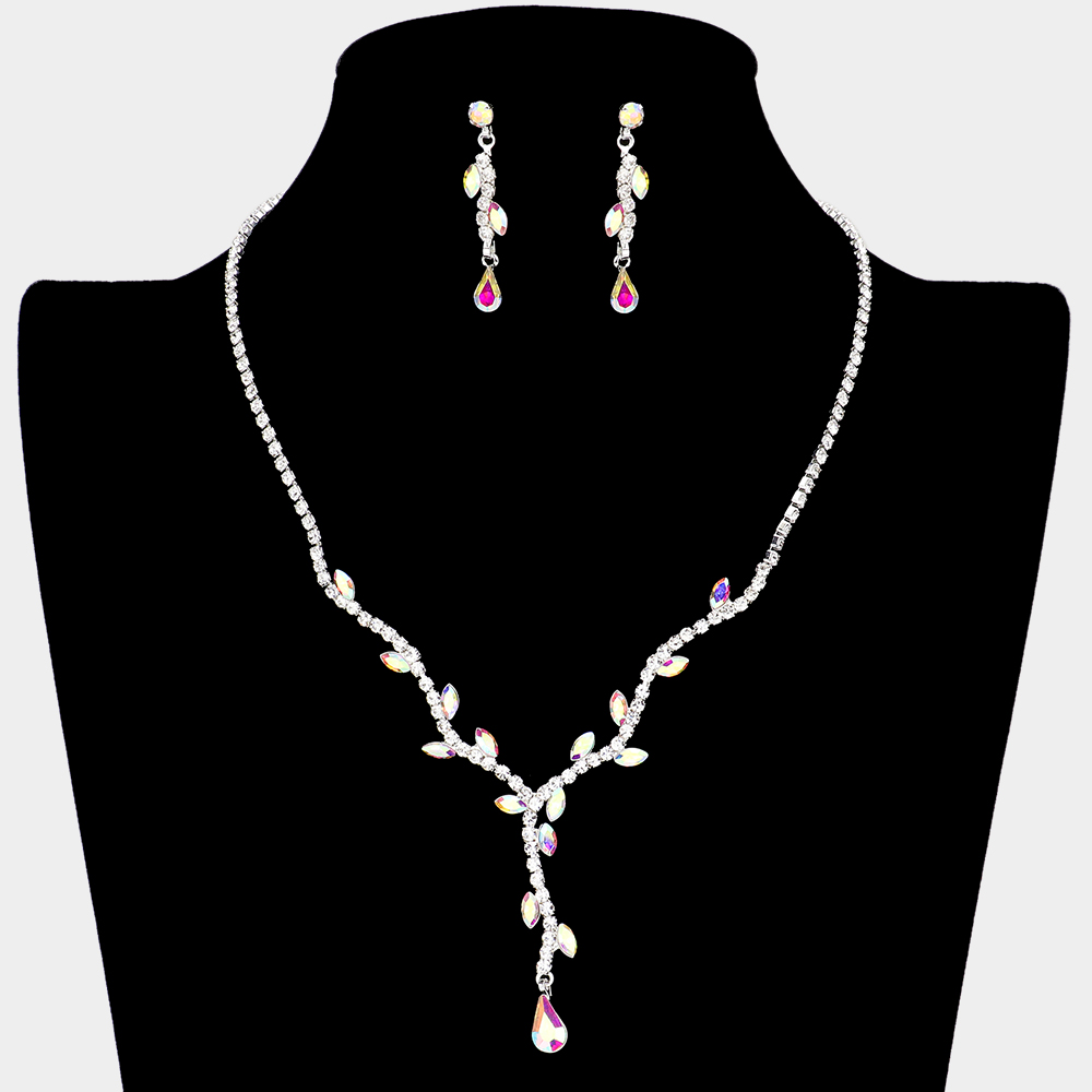 • Elegant necklace and earring set with shimmering leaf-shaped stones and a delicate drop pendant. Perfect for weddings, proms, and special events for a refined and glamorous look.