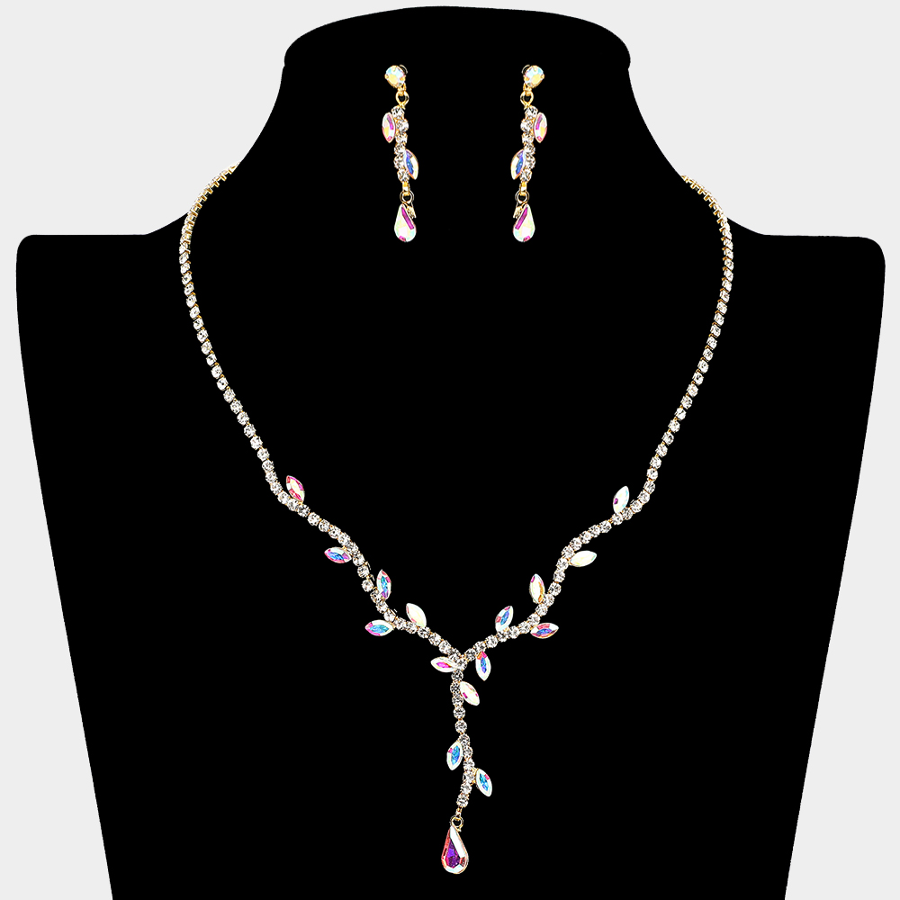 Details • Necklace Size : 16" + 4" L • Decor Size : 1.75" L • Earring Size : 1.5" L • Elegant necklace and earring set with shimmering leaf-shaped stones and a delicate drop pendant. Perfect for weddings, proms, and special events for a refined and glamorous look.