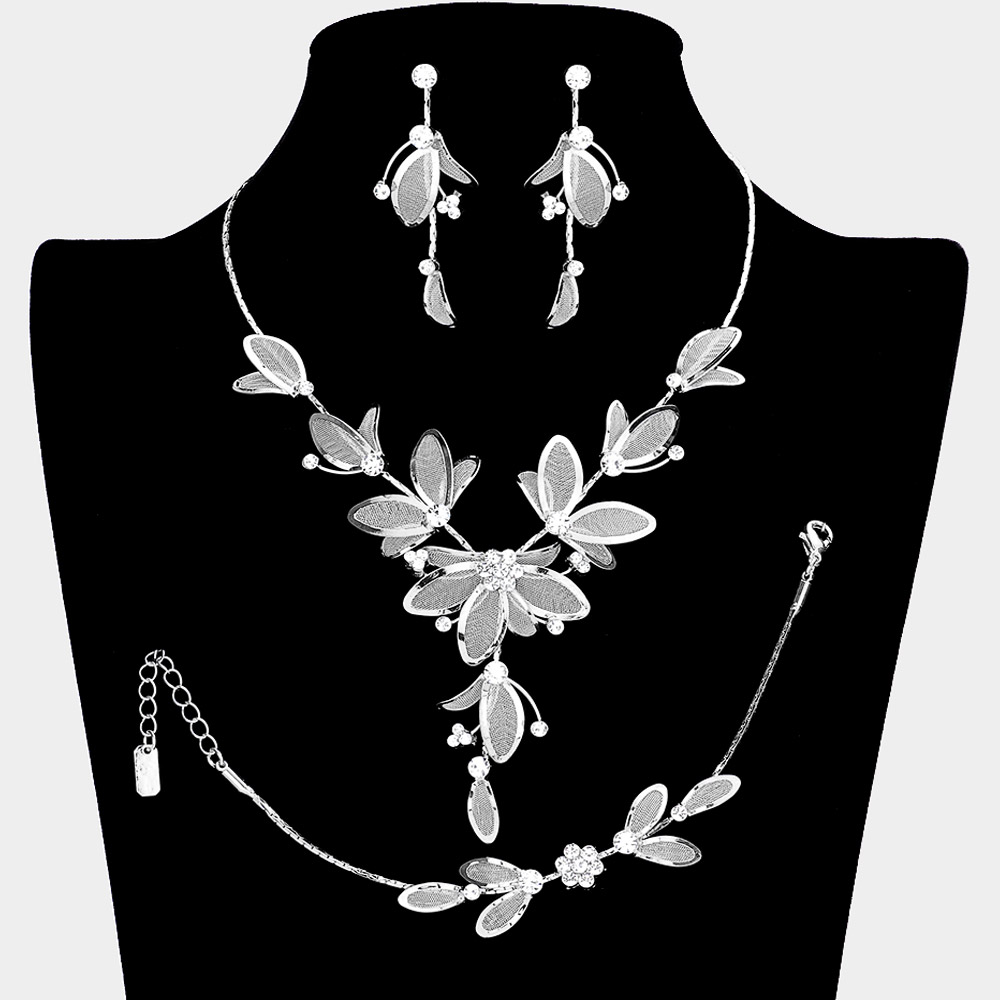 • Elegant floral jewelry set featuring a necklace, earrings, and bracelet. Designed with delicate flower motifs, this set is perfect for weddings, parties, and special occasions, adding refined charm and timeless sophistication to your style.