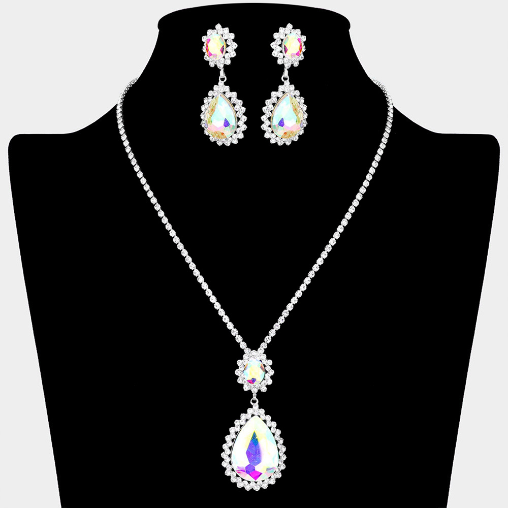 Details • Necklace Size : 13" + 4" L • Decor Size : 2" L • Earring Size : 1.75" L • Discover timeless elegance with this teardrop crystal necklace and earring set. Featuring a radiant teardrop centerpiece with matching earrings, it’s the perfect choice for weddings, proms, and special occasions. Add sophistication and sparkle to your evening look.