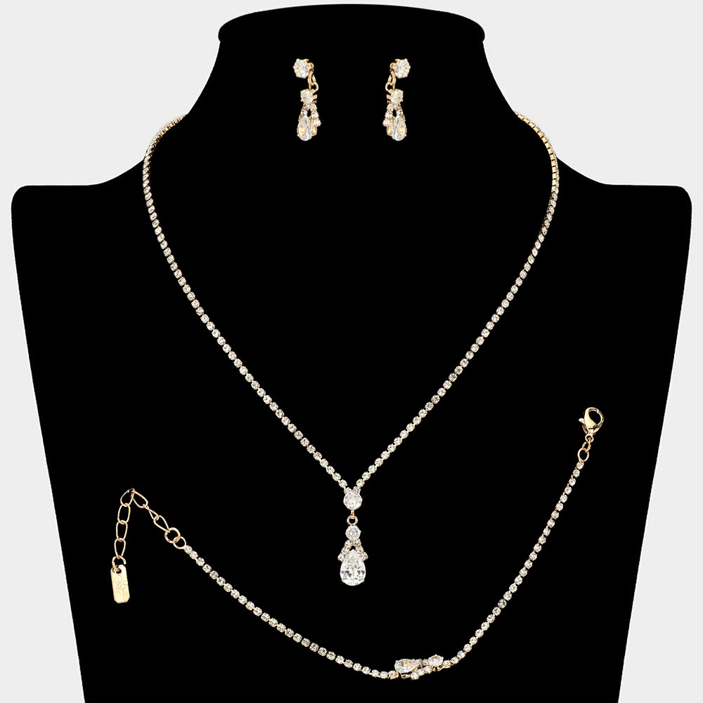 • Refined and radiant, this jewelry set features a teardrop crystal pendant necklace, matching bracelet, and coordinating drop earrings. Designed with a gold-tone finish and shimmering stones, it’s the perfect choice for weddings, galas, or evening occasions that call for graceful luxury.