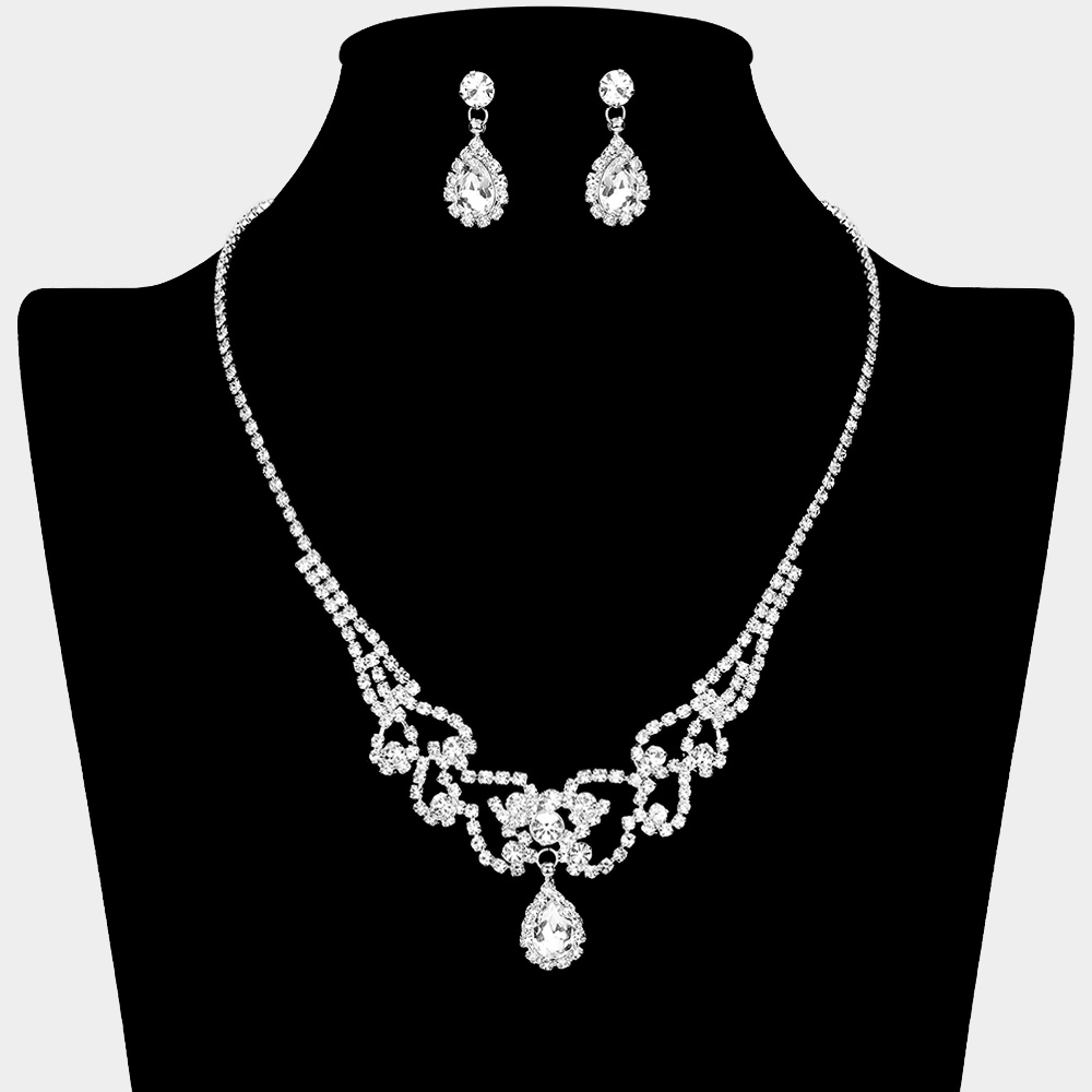 Details • Necklace Size : 16.5" + 3" L • Decor Size : 1.25" L • Earrings Size : 1" L • Elevate your bridal look with this sparkling crystal necklace and earring set. Featuring an intricate design with a teardrop pendant, it adds timeless elegance to weddings, proms, and formal occasions. Perfect for brides and special events. • Lead and Nickel Compliant