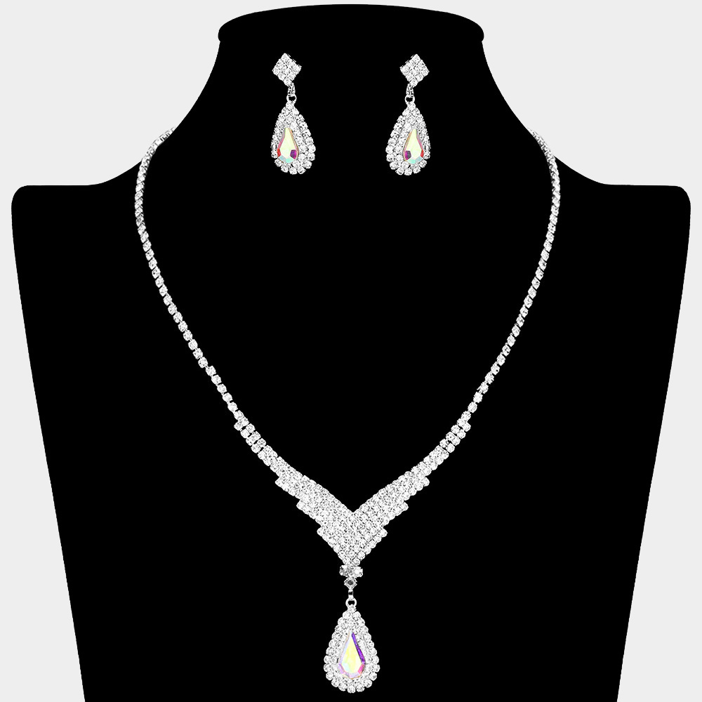 Details • Necklace Size : 16.5" + 4.5" L • Decor Size : 1.8" L • Earrings Size : 1.3" L • Shine with this rhinestone teardrop necklace and earrings set, perfect for weddings, formal parties, and prom nights. Featuring a sparkling teardrop pendant and matching earrings, this jewelry set offers timeless elegance and sophistication for brides, bridesmaids, or evening wear. • Lead and Nickel Compliant