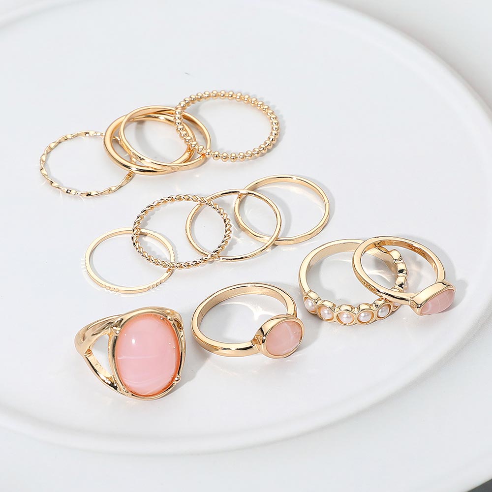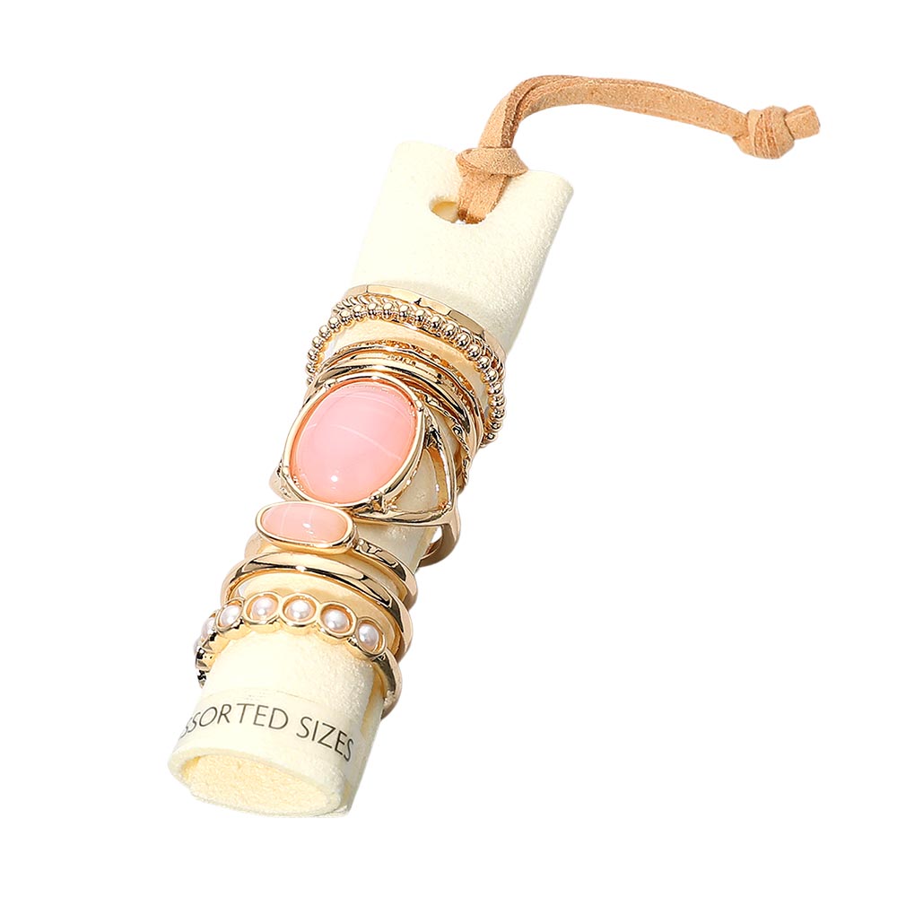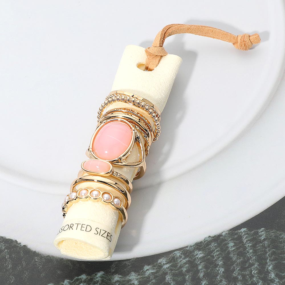 12PCS - Assorted Resin Stone Accent Pearl Link Textured Metal Stackable Ring Set