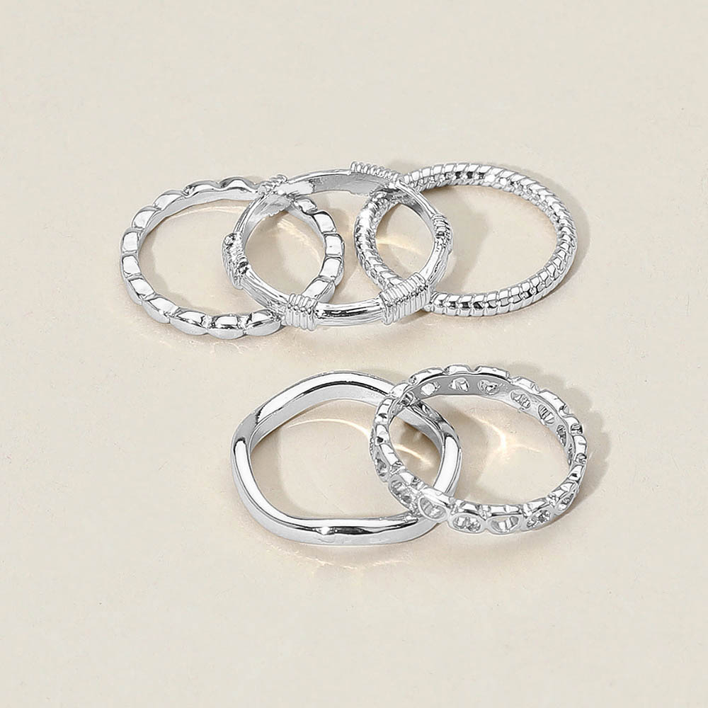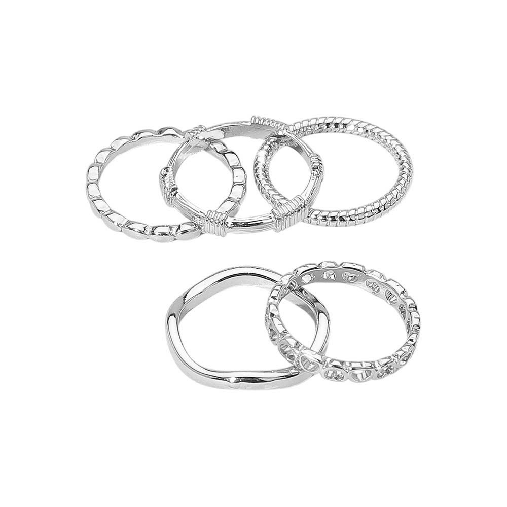 Details • Size : 0.1" H (size 7 Only) • Trendy stackable ring set featuring a mix of minimalist and textured designs. Perfect for creating a layered look or wearing individually, this versatile collection adds a chic touch to everyday outfits and special occasions alike. • Lead and Nickel Compliant