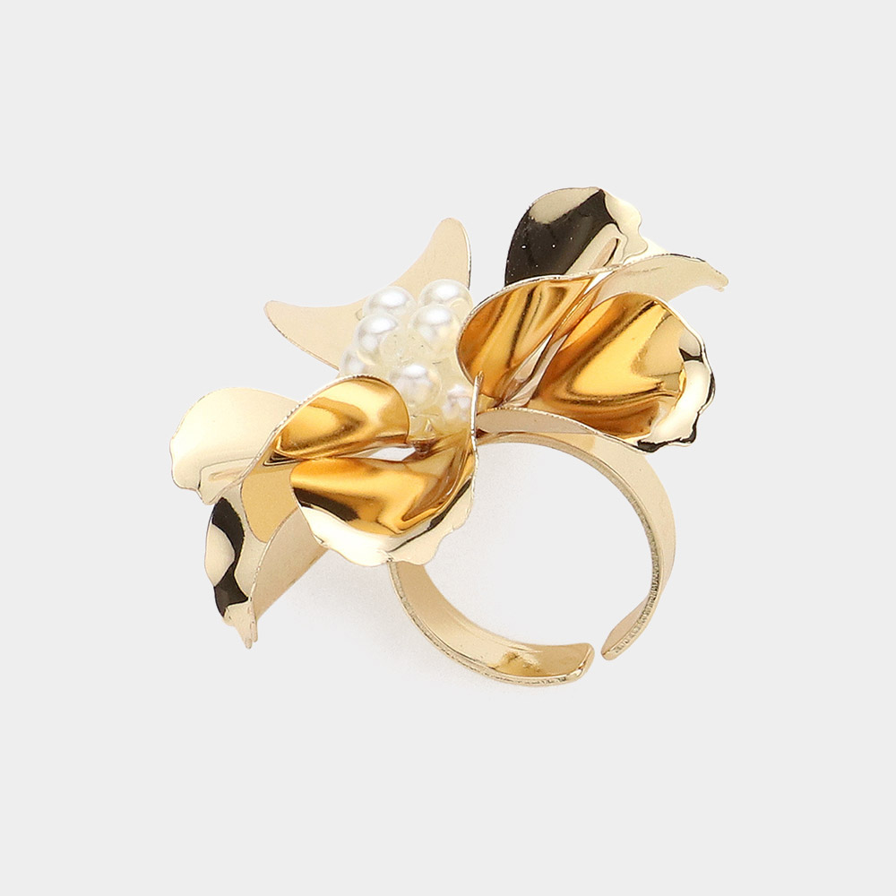 Beaded Ball Center Metal Petal Flower Adjustable Ring