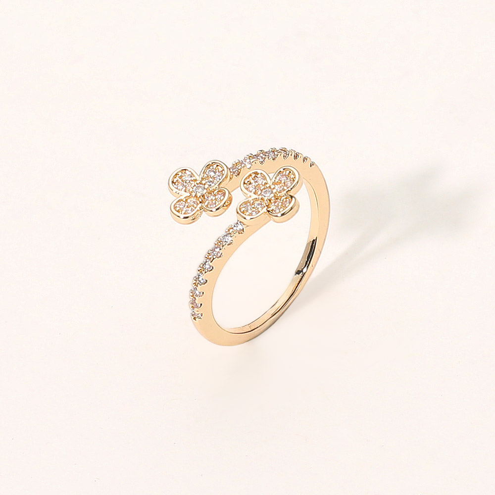 • Elegant adjustable ring featuring two sparkling quatrefoil designs for a feminine and stylish touch. Perfect for adding delicate charm to everyday wear or special occasions, this open-band ring offers comfort, shine, and timeless floral elegance.