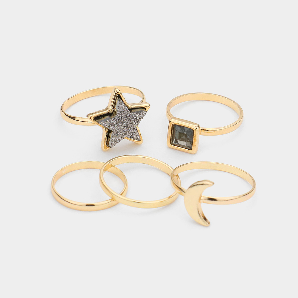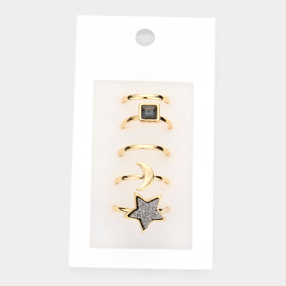 5PCS - Square Stone Metal Crescent Moon Druzy Star Mixed Rings