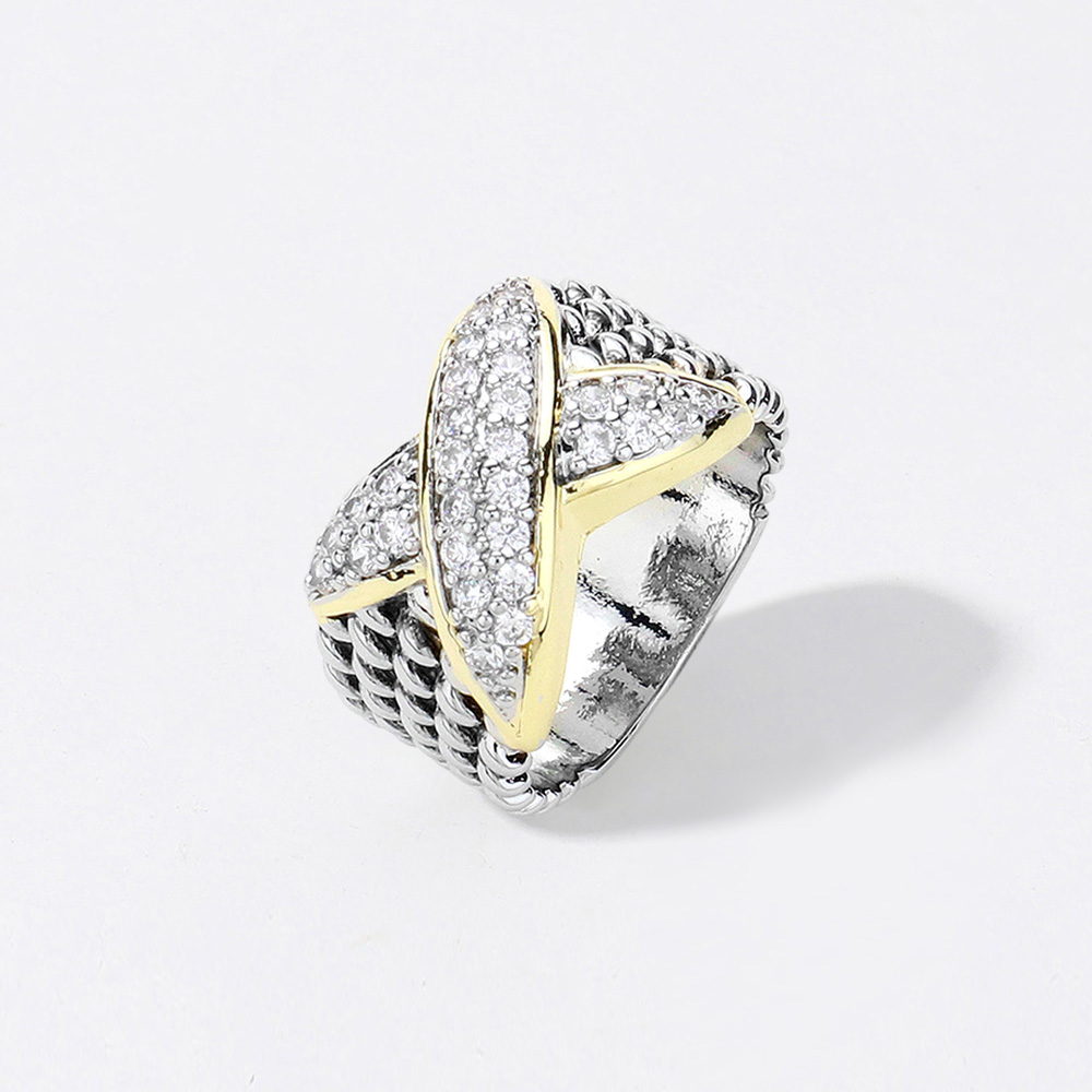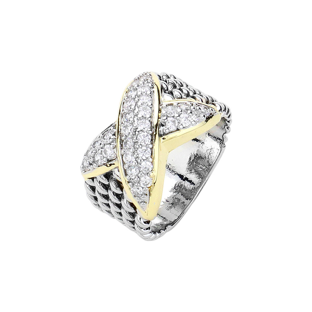 CZ Stone Paved Crisscross Pointed Two Tone Ring