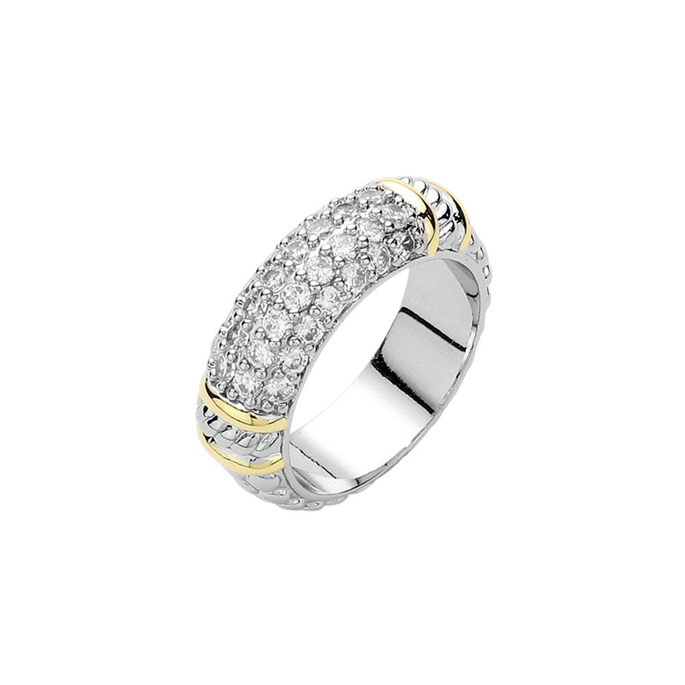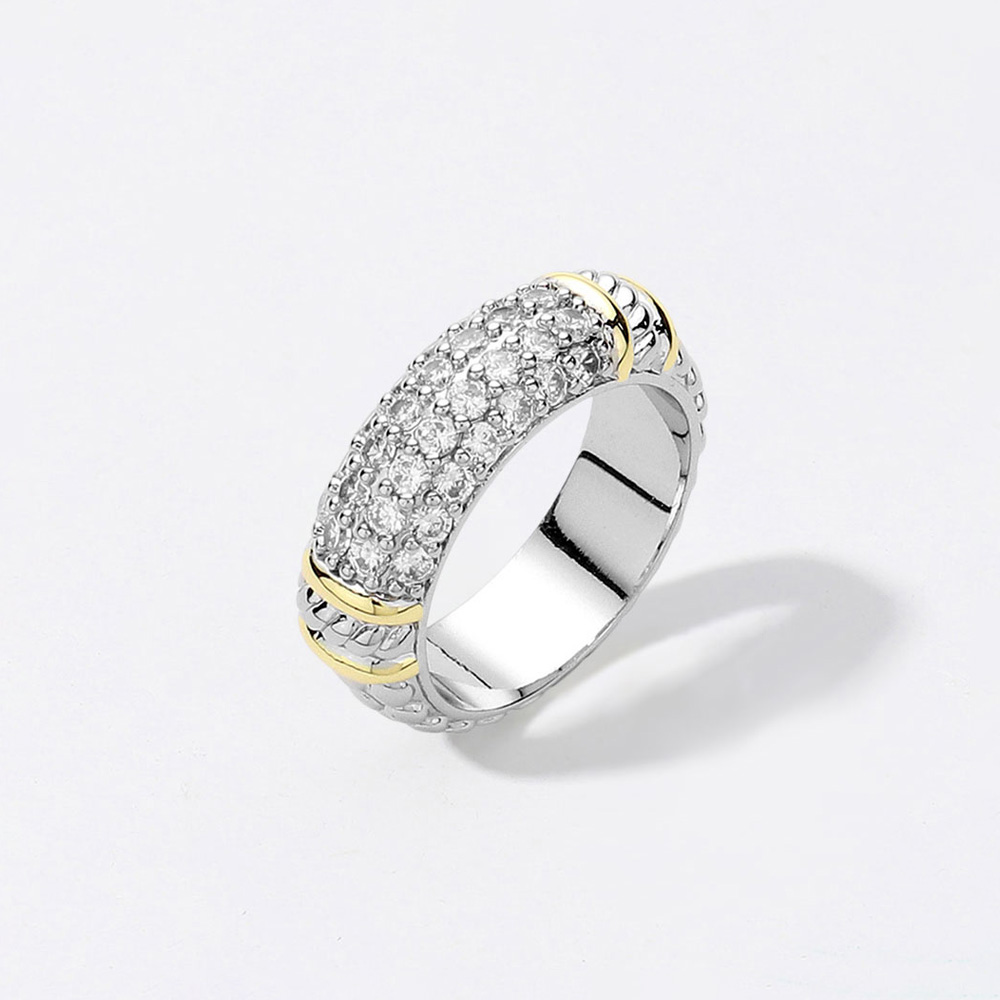 • Sophisticated band ring featuring a pave CZ design and textured accents. A timeless accessory for both casual and formal occasions.