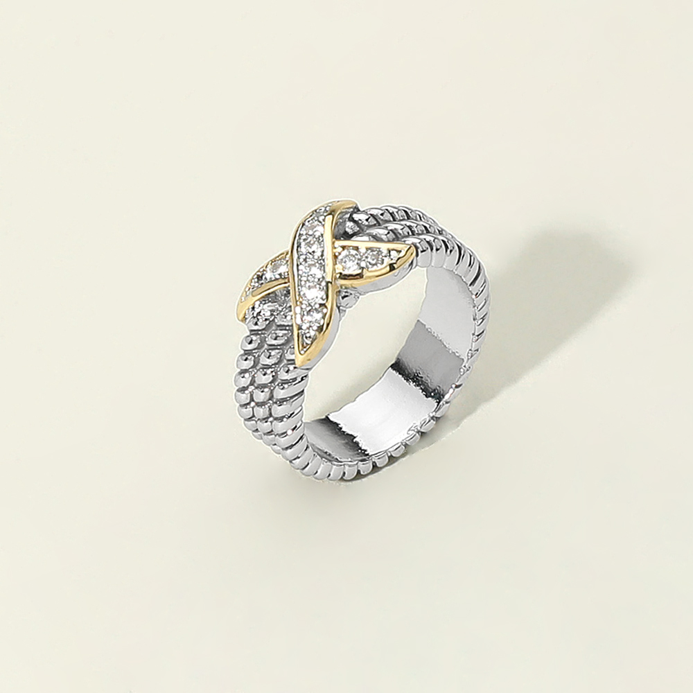 Two Tone CZ Stone Paved Crisscross Accent Textured Ring Two Tone CZ Stone Paved Crisscross Accent Textured Ring