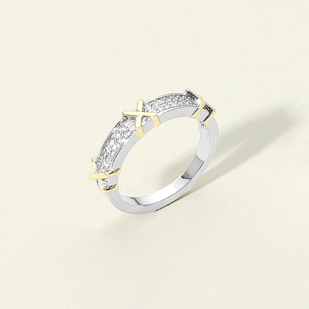 Details • Size : 0.2" H • Add modern sophistication to your look with this two-tone band ring featuring elegant X-shaped accents and sparkling pave detailing. Its sleek, timeless design blends classic charm with contemporary flair, perfect for elevating everyday wear or evening ensembles. • CZ Cubic Zirconia