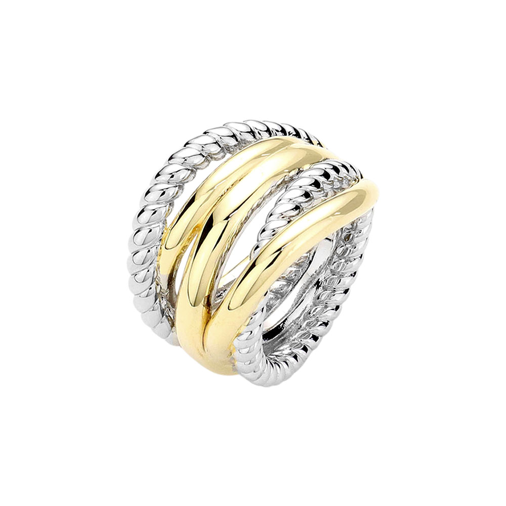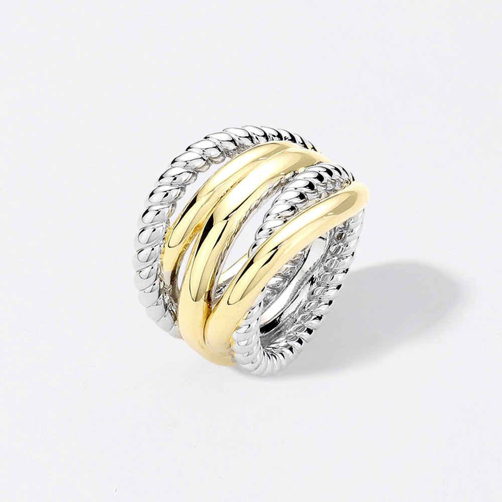 Details • Size : 0.75" H • Elevate your style with this two-tone multi-band ring featuring a mix of polished and textured finishes. A bold yet elegant statement piece perfect for daily wear, special occasions, or gifting to someone who loves modern and versatile jewelry.