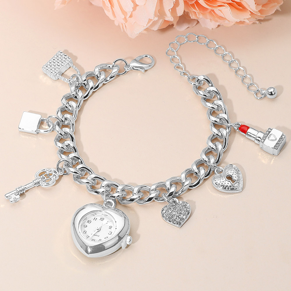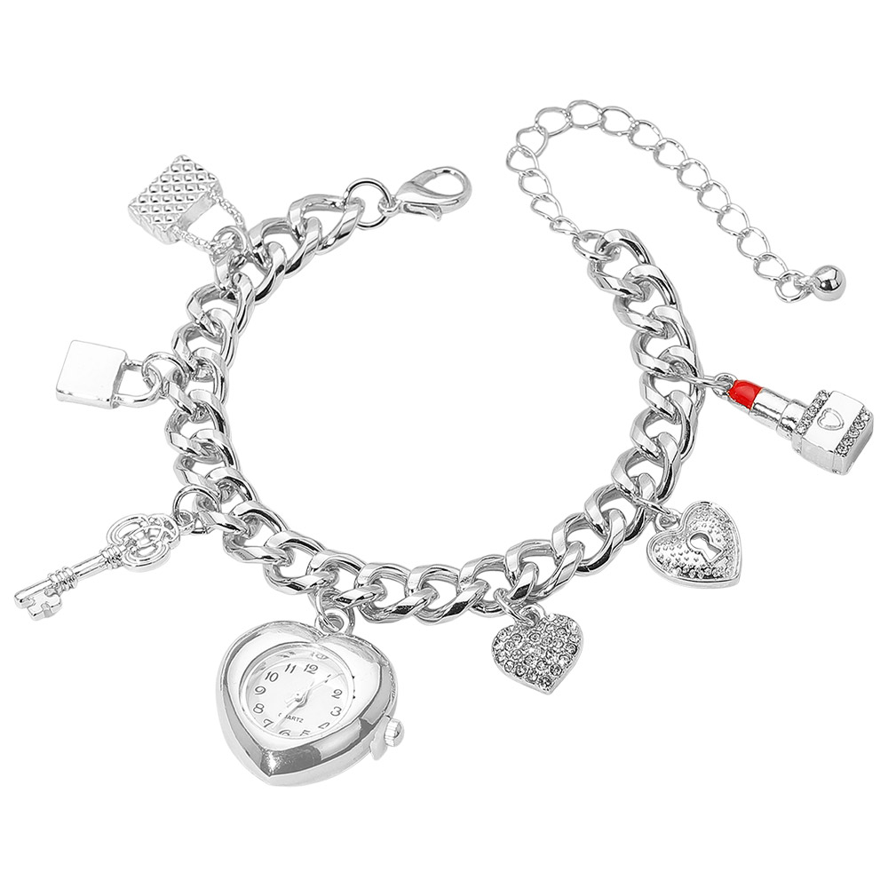 • Bring playful elegance to your wrist with this heart charm bracelet watch. Featuring a polished chain adorned with hearts, a key, and a lipstick charm, it combines chic detail with everyday functionality. A stylish timepiece that adds sparkle and personality to any look.