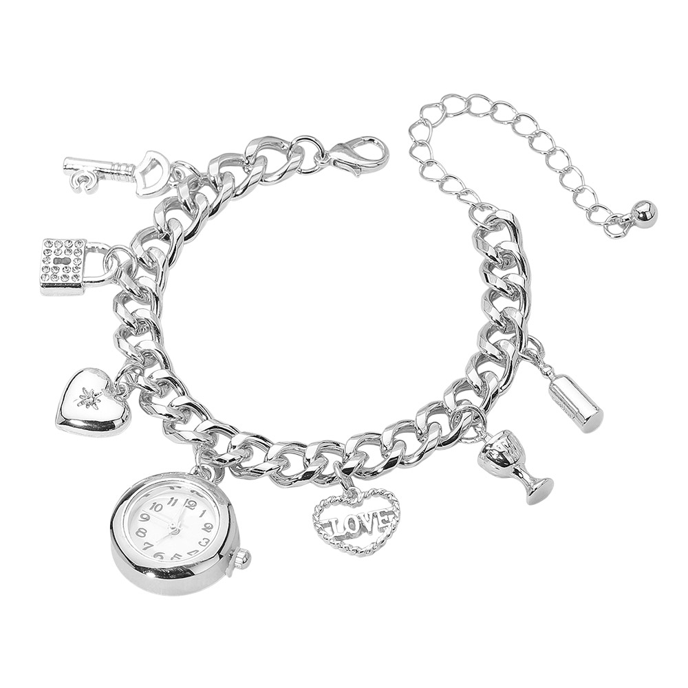 • Add sparkle and romance to your wrist with this love charm bracelet watch. Designed with a polished chain and detailed charms including a heart, key, and goblet, it perfectly blends fashion and function, making it an ideal accessory for both everyday and special occasions.