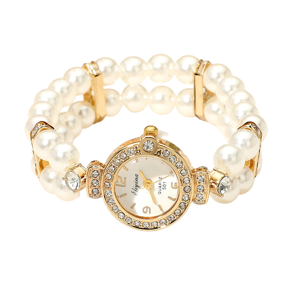 Details • Size : 0.9" H • Stretchable • Water Resistant • Discover timeless elegance with this pearl strap quartz watch featuring rhinestone accents around the dial. Designed with a bracelet-inspired look, it combines the charm of jewelry with practical timekeeping, making it the perfect accessory for both casual and formal occasions.