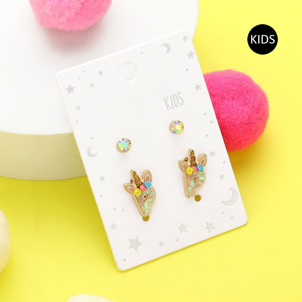 2Pairs - K Round Stone Unicorn Initial Monogram Stud Kids Earrings