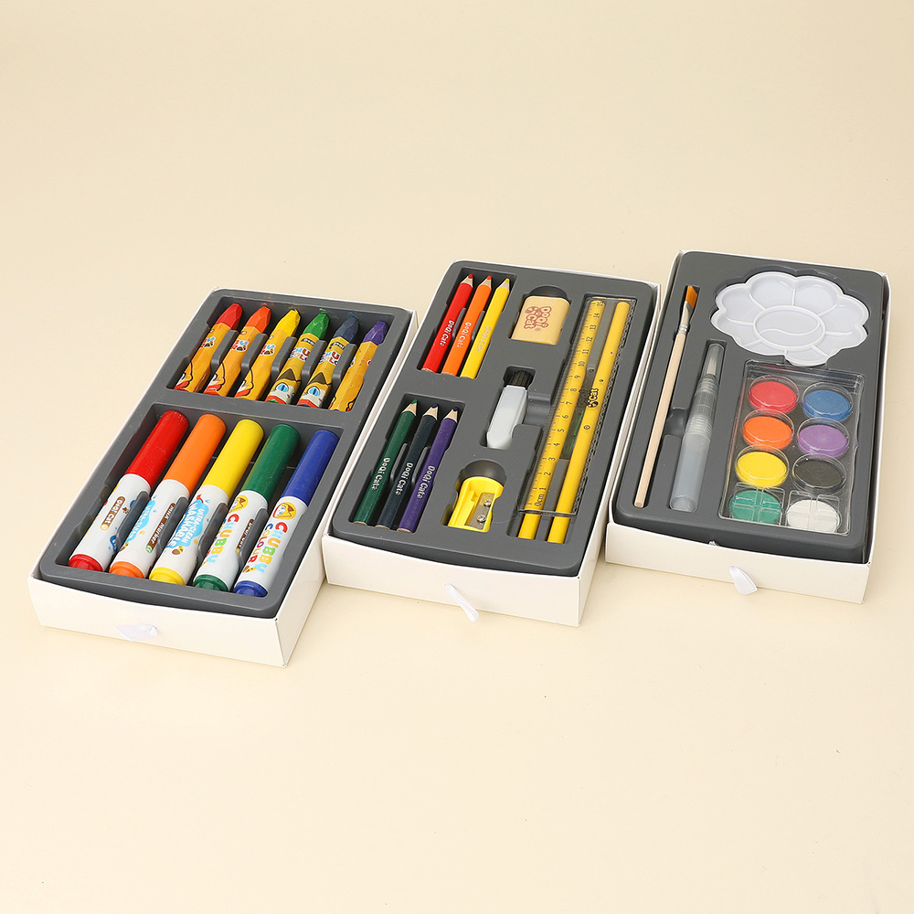 • 1 Ruler, 1 Brush, 1 Eraser, 1 Palette, 15 Stickers, 2 HB Pencils, 1 Blossom Palette, 1 Watercolor Brush, 5 Washable Markers, 1 Coloring Book, 8 Watercolor, 1 Sharpener, 6 Oil Pastels, 6 Color Pencils, 10 Paper Clips Included