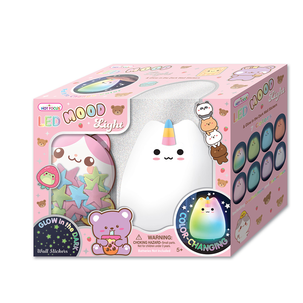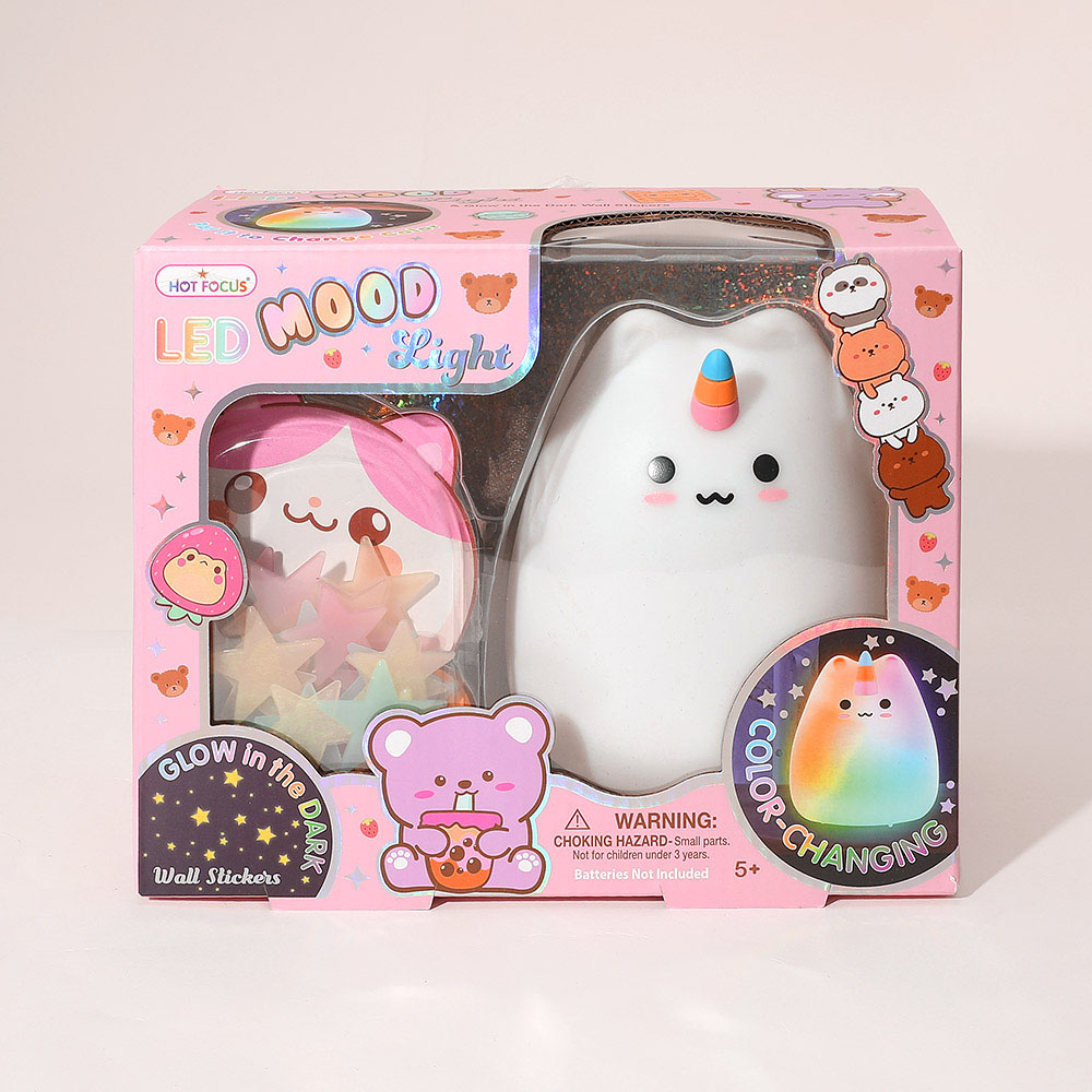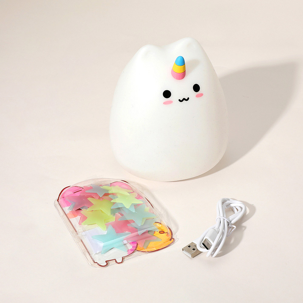 Details • Lamp Size : 4.5" X 5.25" • Glow in the Dark Star Sticker Size : 1.25" X 1.25" (25PCS) • 7 Colors : Including Gradient Mode and Flashing Mode • Tap to Change Colors • BPA Free Soft Silicone Material • Operated by Batteries or USB-C Charging Cable • Pat Design / Multimode / Safe Silicon / Eye Care / Decor and Gift • 1 LED Mood Light, 1 USB Charging Cable and 25 Glow in the Dark Wall Stickers Included
