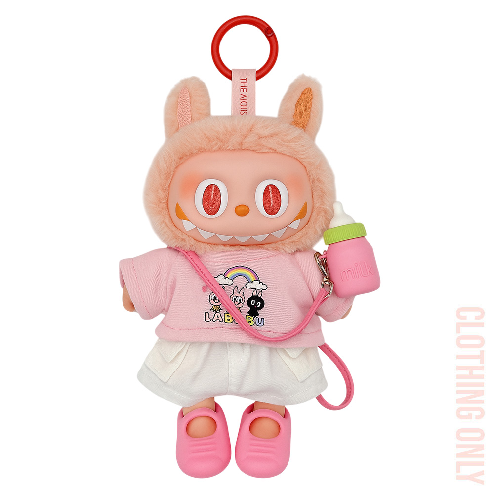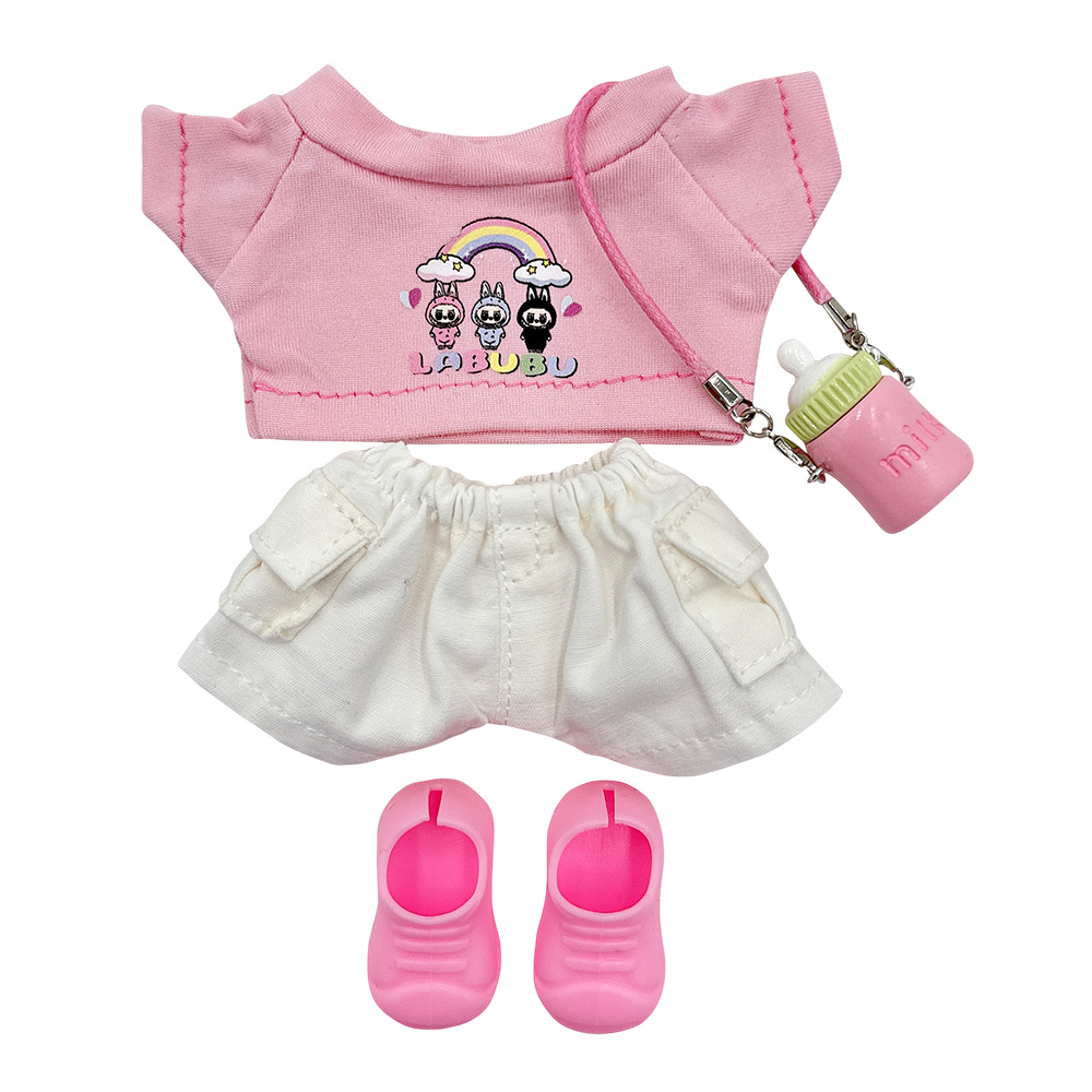 Details • Size : One Size • Material : 100% Polyester • Labubu Doll Compatible • Doll NOT Included • Cute doll clothing set featuring a cartoon print top, denim-style shorts, matching shoes, and a milk bottle accessory. Perfect for dressing up dolls and adding playful style to their collection.