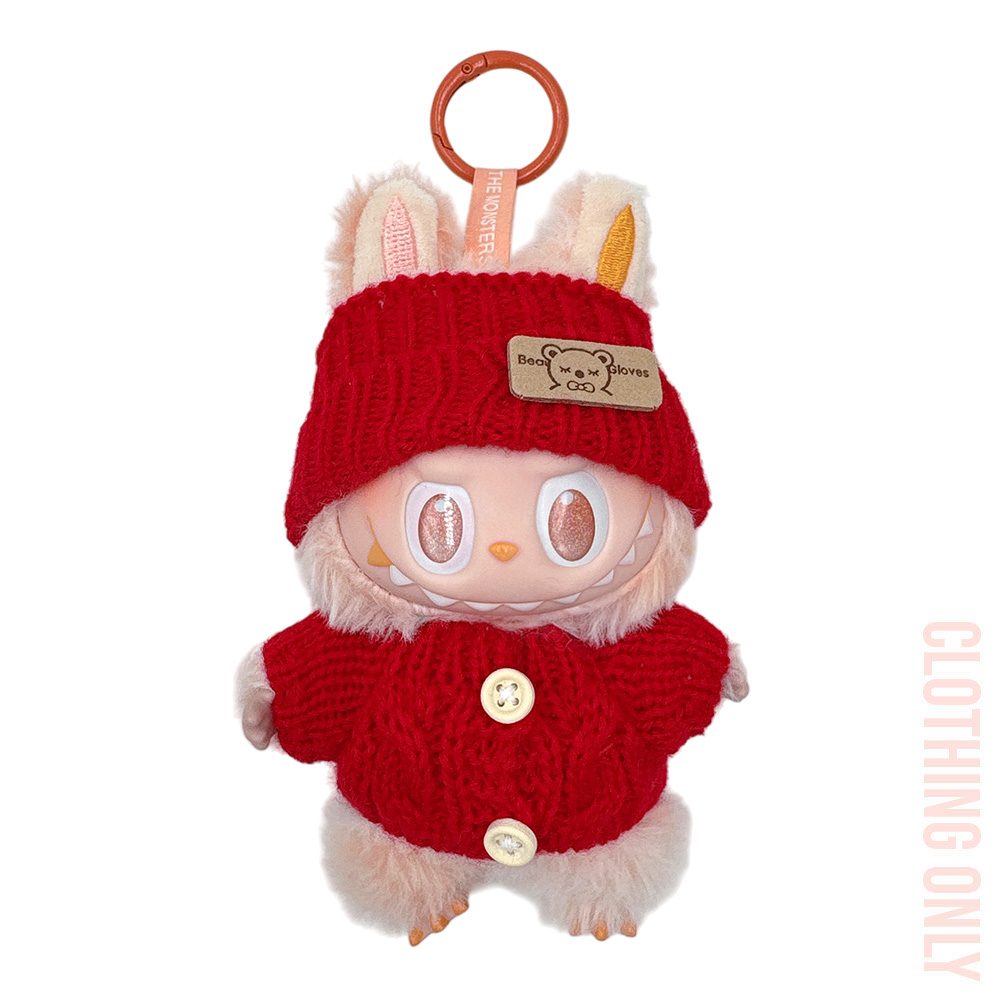 Details • Size : One Size • Material : 100% Polyester • Labubu Doll Compatible • Doll NOT Included • Adorable knitted doll clothing set featuring a buttoned sweater and matching scarf. Perfect for giving dolls a cozy, stylish look and keeping them warm during pretend play adventures.