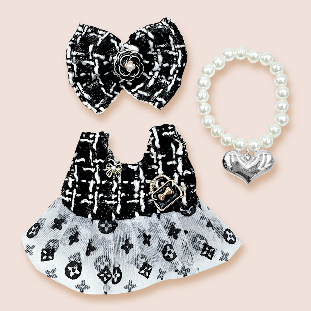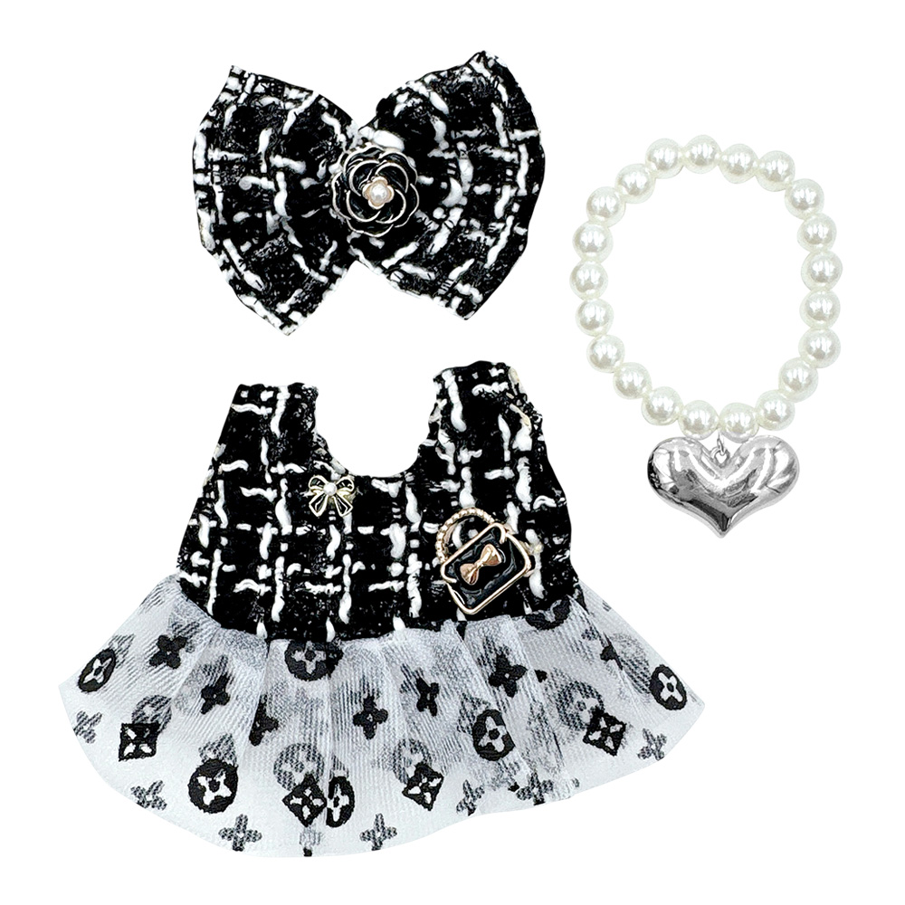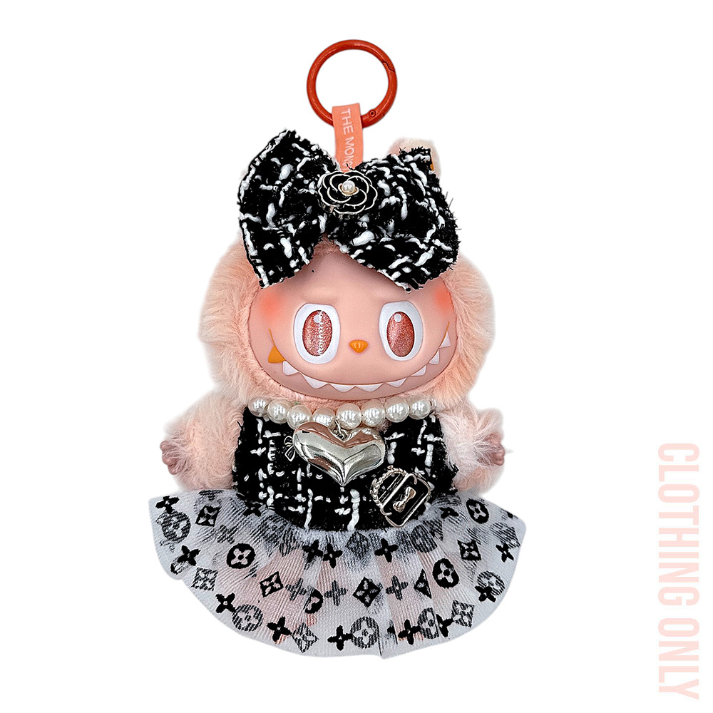 Details • Size : One Size • Dress, headbow and pearl necklace included • Labubu Doll Compatible • Doll NOT Included • Material : 100% Polyester • Give dolls a chic makeover with this stylish dress set featuring a tweed-inspired dress, matching bow hairpiece, and pearl bracelet with heart charm. Perfect for fashion play, this elegant outfit set adds sophistication and fun to any doll’s wardrobe collection.