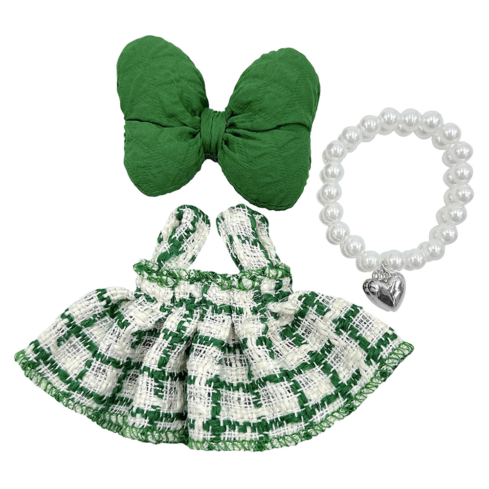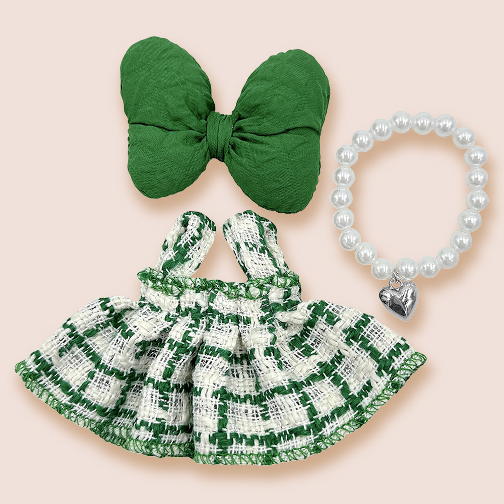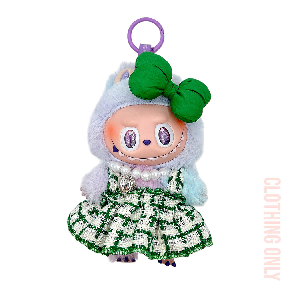 Details • Size : One Size • Skirt, Bow and Pearl Necklace Included • Labubu Doll Compatible • Doll NOT Included • Material : 100% Polyester • Complete outfit set for mini plush dolls including a bow, skirt, and pearl-style bead necklace. Perfect for dressing up your collectible figures. Clothing only.