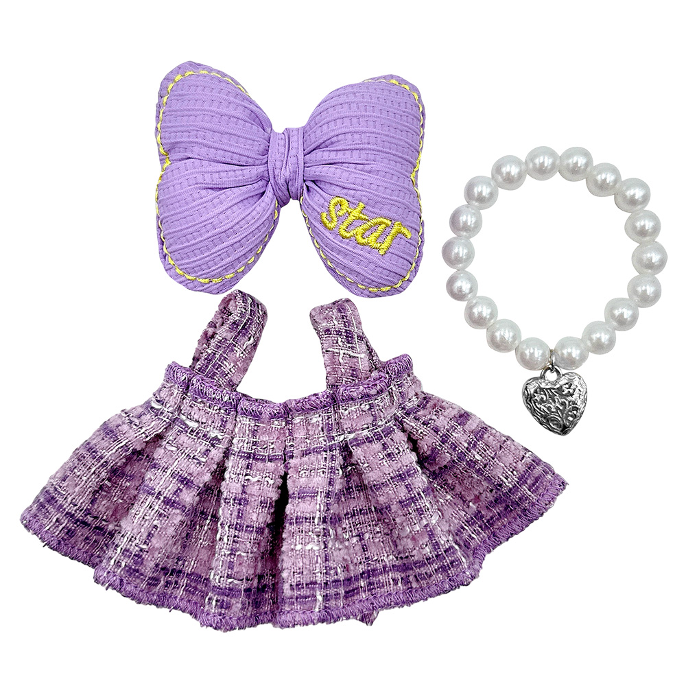Details • Size : One Size • Skirt, Bow and Pearl Necklace Included • Labubu Doll Compatible • Doll NOT Included • Material : 100% Polyester • Complete outfit set for mini plush dolls including a bow, skirt, and pearl-style bead necklace. Perfect for dressing up your collectible figures. Clothing only.