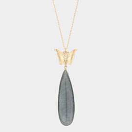 Butterfly Natural Stone Teardrop Link Pendant Long Necklace