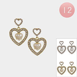 12Pairs - Heart Pearl Pointed Stone Paved Open Heart Dangle Earrings